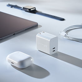 Dual USB-C (Type C) Ports with fast charge up to 30W packed in the size of an AirPods.