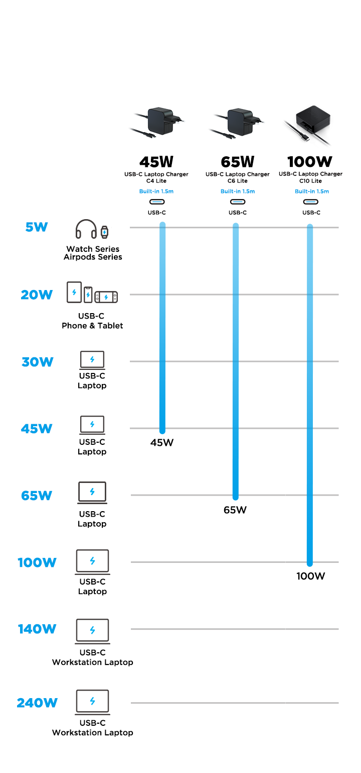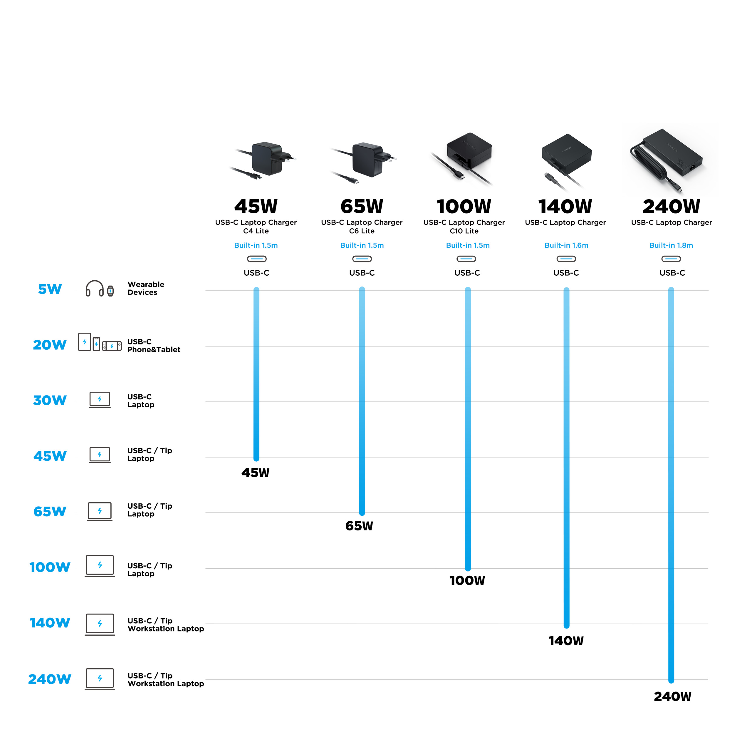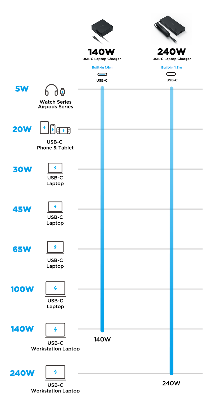 Mendukung pengisian daya USB PD dari 30W, 45W, 61W, 67W hingga 96W*. Mengisi daya sebagian besar perangkat USB Type-C dengan cepat, termasuk laptop, smartphone, tablet, konsol game, speaker, dan lainnya.