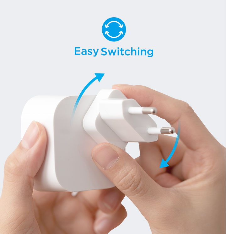 Steker travel dalam 4 versi ( US, EU, UK, dan AU ) mencakup kebutuhan pengisian daya di 150 negara. Instalasi dua arah yang dipatenkan memudahkan untuk mengubah posisi adaptor sesuai keinginan anda bahkan di ruang yang terbatas.