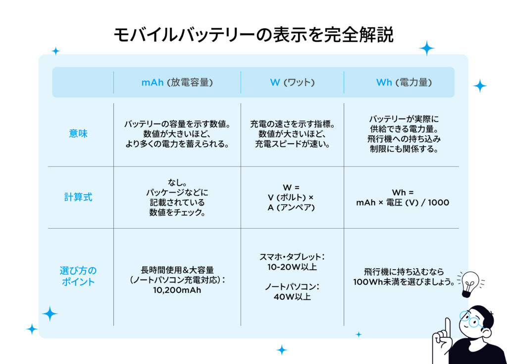 モバイルバッテリーを選ぶときに「mAh」という表記を見たことはありませんか? これはバッテリーの容量を示す単位で、「放電容量(milliampere-hour)」の略です。数値が大きいほど、多くの電力を蓄えられ、より長く使うことができます。
