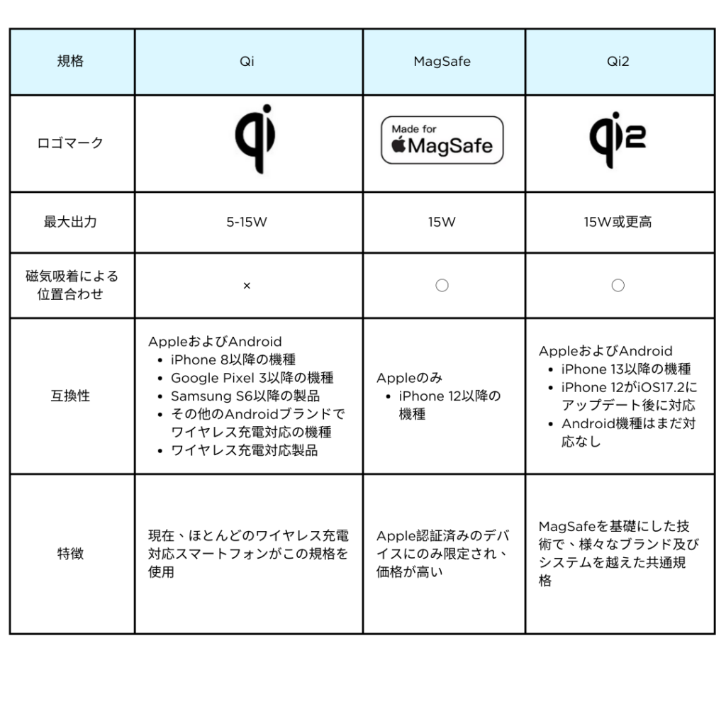 2023年にワイヤレス充電連盟 WPC(Wireless Power Consortium)は、新しいワイヤレス充電規格「Qi2」を発表しました。Qi2は、充電速度、磁気による正確な位置合わせ、そしてシステムの互換性がアップグレードされました。旧規格のQiワイヤレス充電器では、iPhoneの充電出力は7.5Wに制限され、AppleのMagSafe認証充電器を使用した場合のみ15Wで充電が可能でした。しかしQi2規格では、iOSとAndroidのスマートフォンを同じマグネット充電デバイスを用いた、正確な位置での最大15W急速充電が可能になりました。