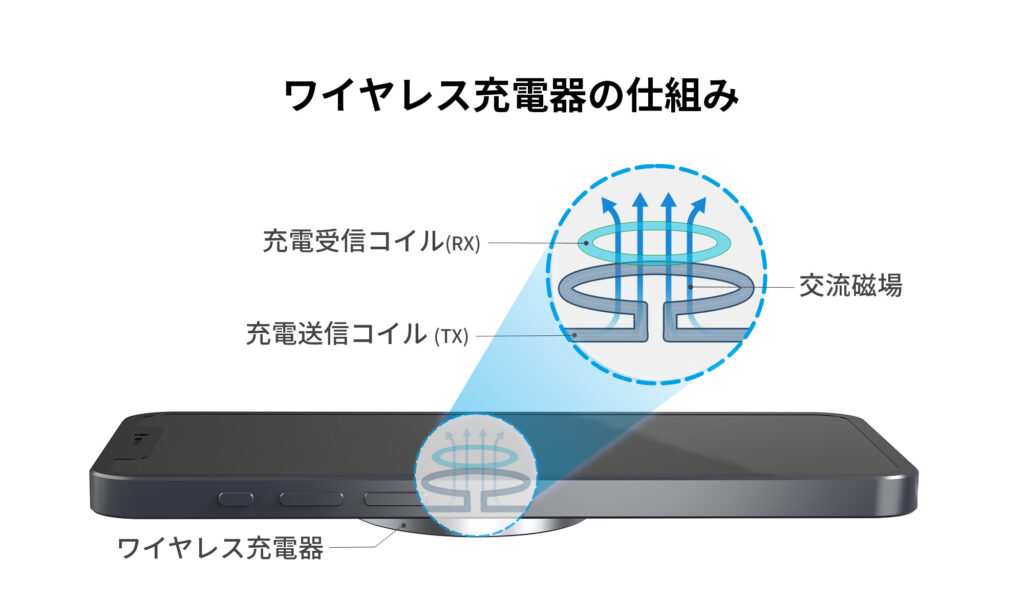 ワイヤレス充電は、電磁誘導を利用してエネルギーを伝達する仕組みです。充電器には充電送信コイル(TX)が搭載され、デバイス側には充電受信コイル(RX)が内蔵されています。充電送信コイル(TX)は、特定の周波数で交流磁場を生成します。両者が近づくと、充電受信コイル(RX)は磁場からエネルギーを受け取り、電磁誘導の仕組みによりそれを電力に変換し、最終的にデバイスを充電します。
