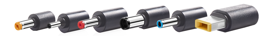 Acer、ASUS、Alienware、Dell、HP、Lenovo、MSIなど、主要ブランドに対応する6種類のプラグを同梱しています。