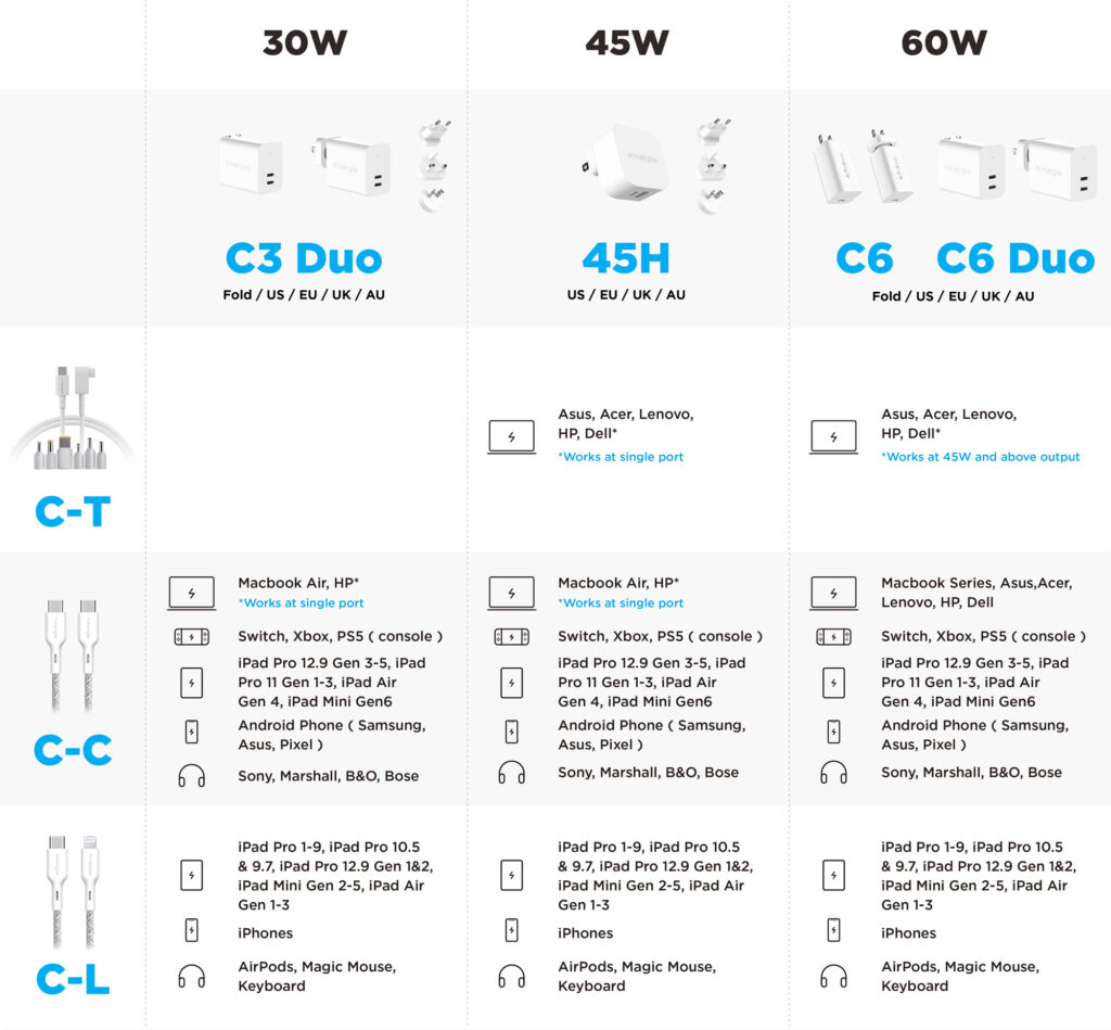 Every Innergie One For All adapter supports PD fast charging. You only need to consider the range of your devices to pick the most suitable adapter: