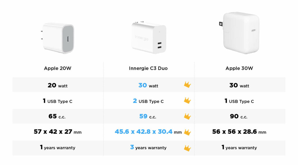 It has more benefit, if we compare Innergie C3 Duo and Apple 30W. Innergie C3 Duo come with smaller size, 2 USB Type C ports, and 3 years warranty.