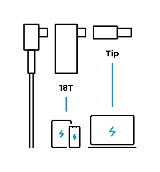 When an adapter with a 18W attached is connected to your laptop, you can have both the laptop and mobile device charging at the same time. When the laptop tip is not connected, the USB-C port can support power for your laptop, gaming devices and more mobile devices.