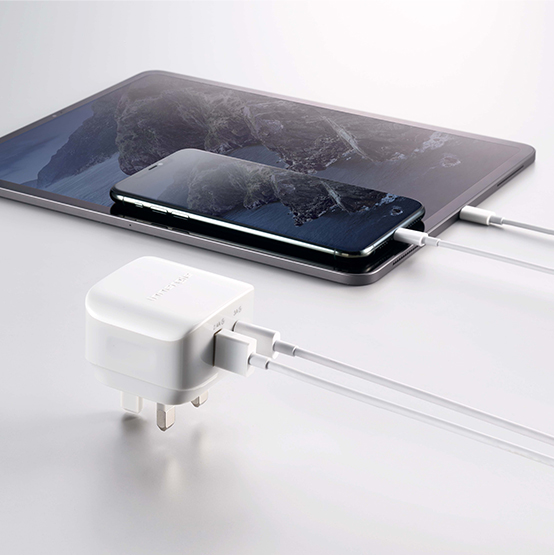 A compact 2-Port USB-C & USB-A wall charger that charges multiple devices at the same time