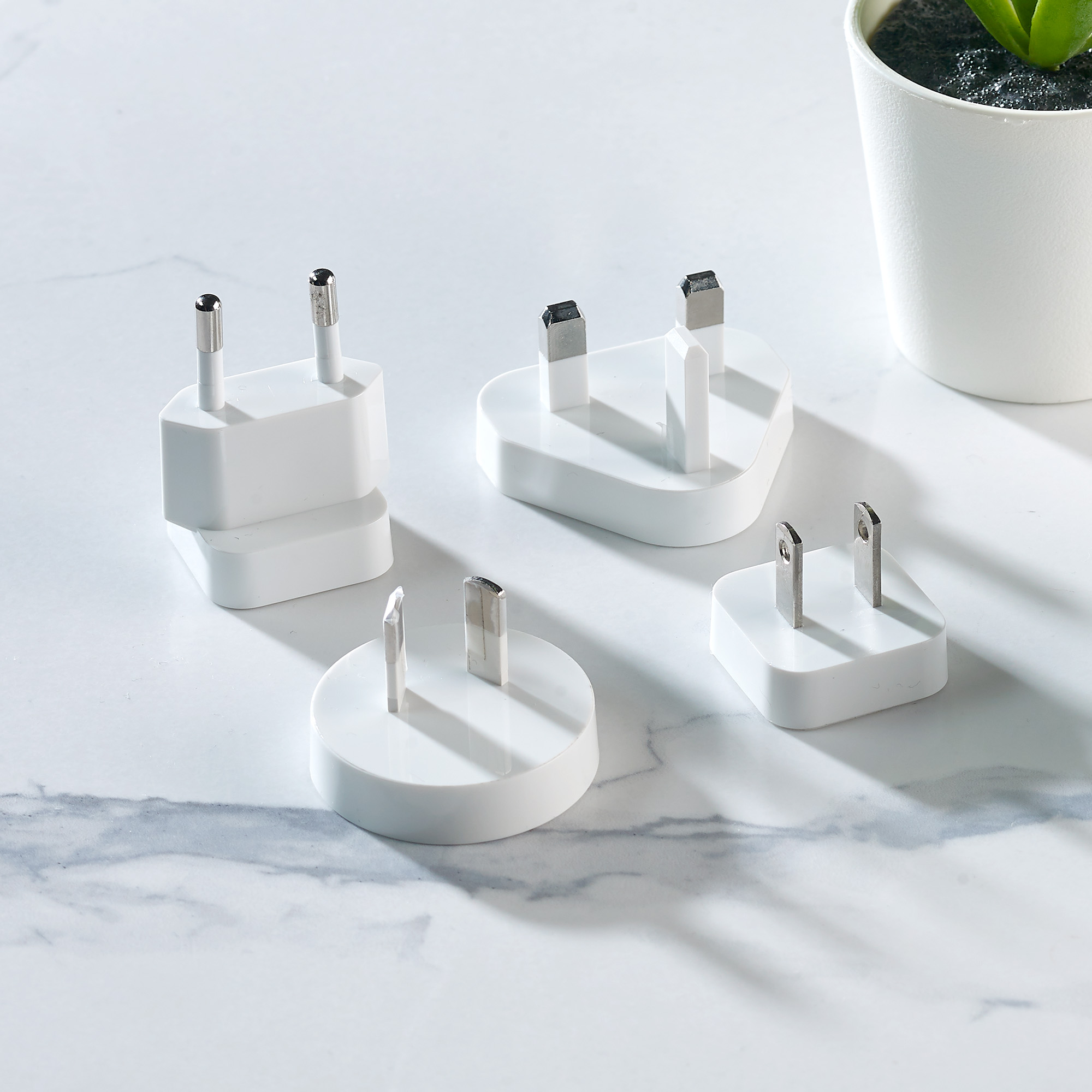4 travel plugs (US, EU, UK, and AU types) cover 150 countries charging needs. The patented dual-way installation allows altering adapter orientation to your preferences and even adapt to limited socket space.