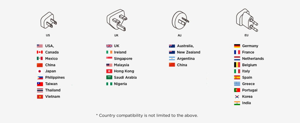 - เปลี่ยนปลั๊กจากประเทศต่างๆ อย่างง่ายดาย : หัวชาร์จรุ่นหัวปลั๊กเดี่ยว สามารถเปลี่ยนหัวปลั๊กของประเทศต่างๆ ได้ตามต้องการ Innergie World Travel Plug Kit มาพร้อมกับหัวปลั๊กตามข้อกำหนด 4 แบบ (US, EU, AU, UK) ซึ่งรองรับการใช้งานได้มากกว่า 150 ประเทศ โดยไม่จำเป็นต้องพกอะแดปเตอร์แปลงไฟสากล เมื่อต้องเดินทางไปต่างประเทศ และยังประหยัดพื้นที่กระเป๋าเดินทาง!