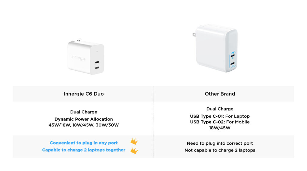 อะไรที่ทำให้ Innergie C6 Duo แตกต่างจากหัวชาร์จ พอร์ตคู่ USB-C 60 วัตต์ ยี่ห้ออื่นๆ?