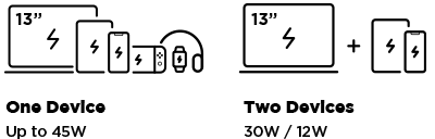 จะจัดสรรพลังงานระหว่างการชาร์จพอร์ตเดี่ยวและพอร์ตคู่ เมื่อชาร์จพอร์ต USB-C เพียงพอร์จเดียวจะจ่ายไฟได้สูงสุดถึง 45 วัตต์ หากชาร์จพร้อมกันทั้งพอร์ต USB-C และ พอร์ต USB จะจ่ายไฟได้สูงสุด 30 วัตต์ และ 12 วัตต์ ตามลำดับ