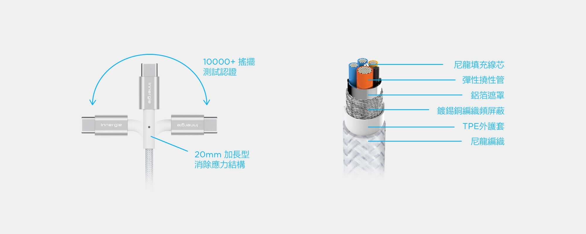 你可以從這邊找到超耐用(15000+耐彎折測試)的Innergie充電線: