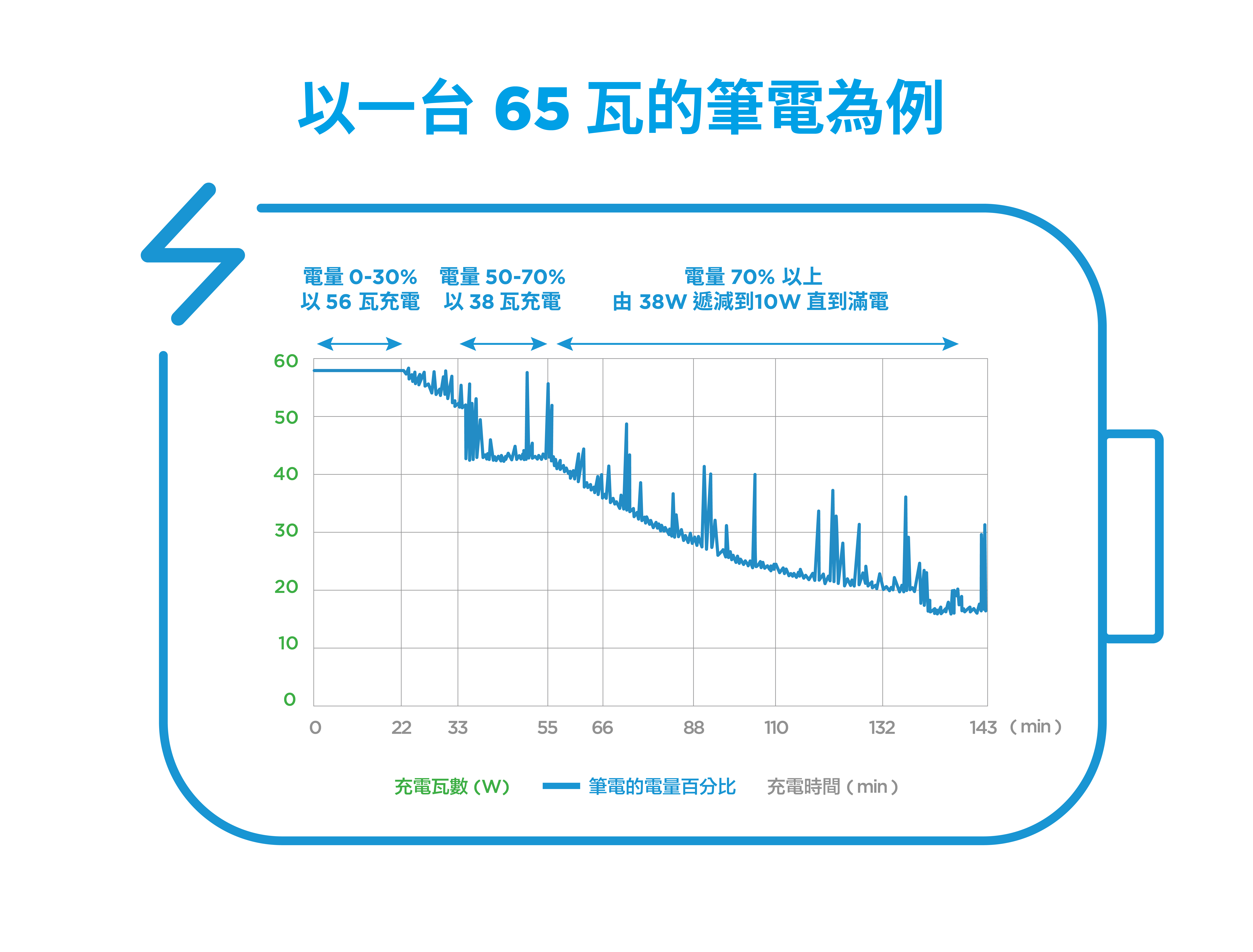 大多數的 3C 裝置都有內建電池管理系統(BMS),它會與充電器進行溝通,根據裝置需求和充電器提供的規格,動態調整充電功率,以確保安全充電。