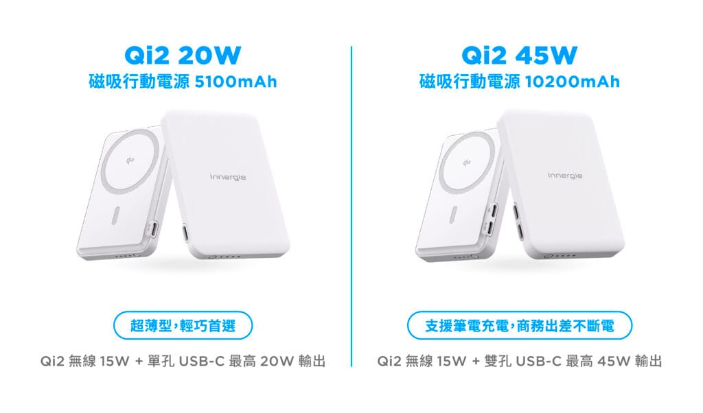 三、推薦旅行好夥伴——Innergie 5100mAh與10200mAh Qi2 磁吸行動電源