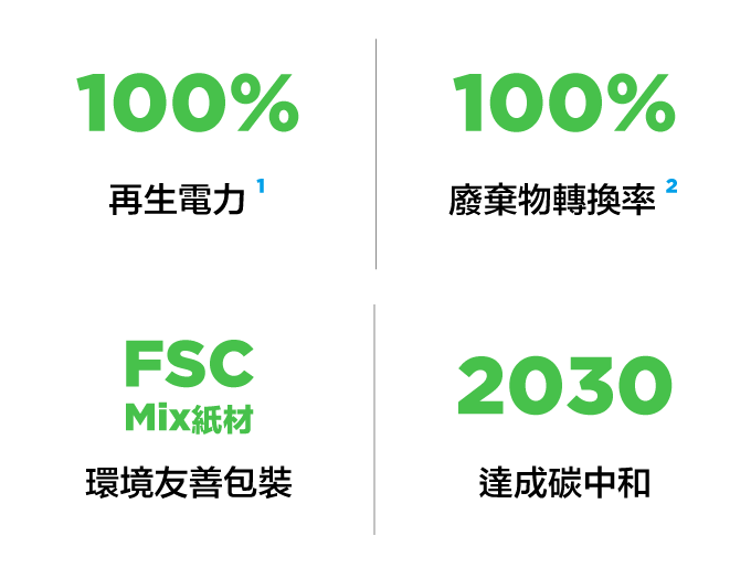 Innergie跟隨台達電子RE100倡議承諾,已在2021年達成以100%再生電力生產1,並將在2030達成碳中和目標。 我們從產品設計、包裝到生產製程都積極減碳,讓消費者有更環保的選擇。