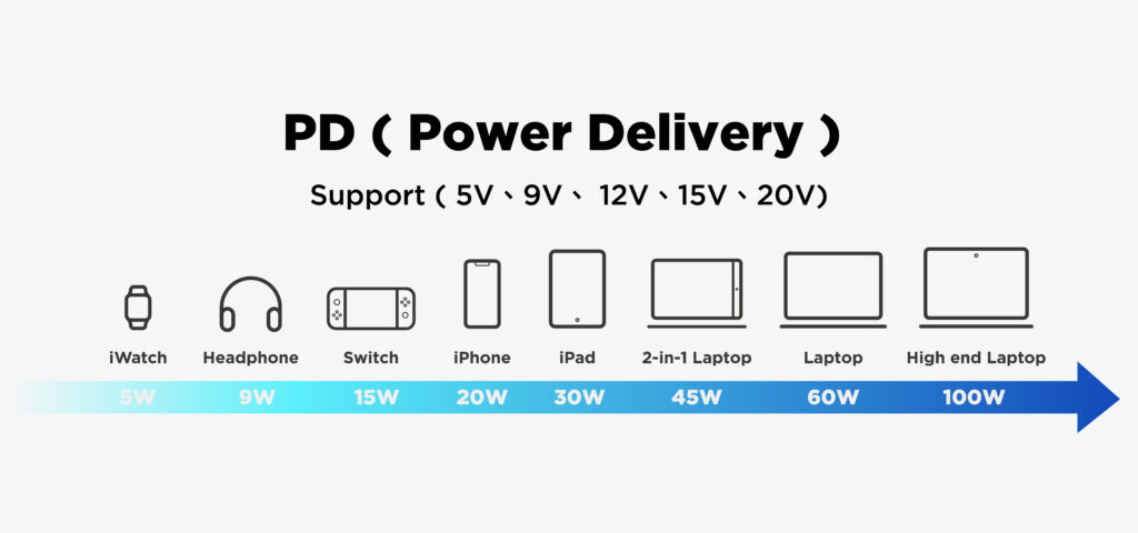 Firstly, USB PD (Power Delivery) fast charger typically feature intelligent systems: smart detection, smart fast charging, and smart distribution. Power Delivery (USB PD) protocol can adjust the charging voltage and current based on the power required by the device. Whether for a single device or multiple devices, they can quickly allocate the most appropriate charging power for each device. Therefore, if you use a 100W charger to charge a 20W phone, the charger will adjust the charging power to match the phone’s specifications, providing a charging rate of 20W.