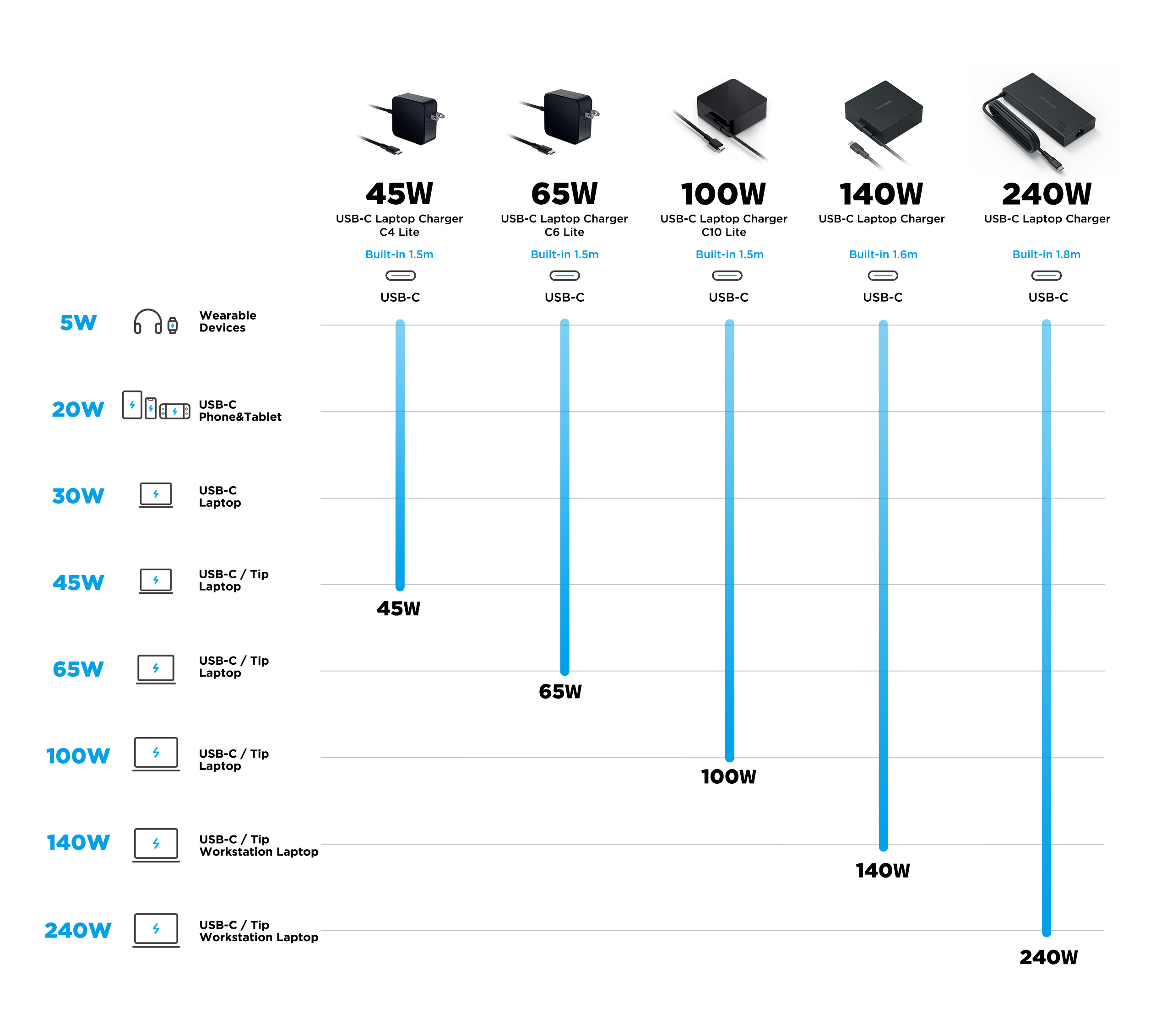 Revolutionary charging technology evolution, with five variable voltages: 5V, 9V, 12V, 15V, and 20V, satisfying the charging needs of various USB-C devices such as smartphones, tablets, and gaming consoles at once.