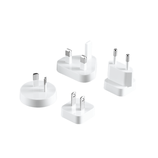 4 travel plugs (US, EU, UK, and AU types) cover 150 countries charging needs. The patented dual-way installation allows altering adapter orientation to your preferences and even adapt to limited socket space.
